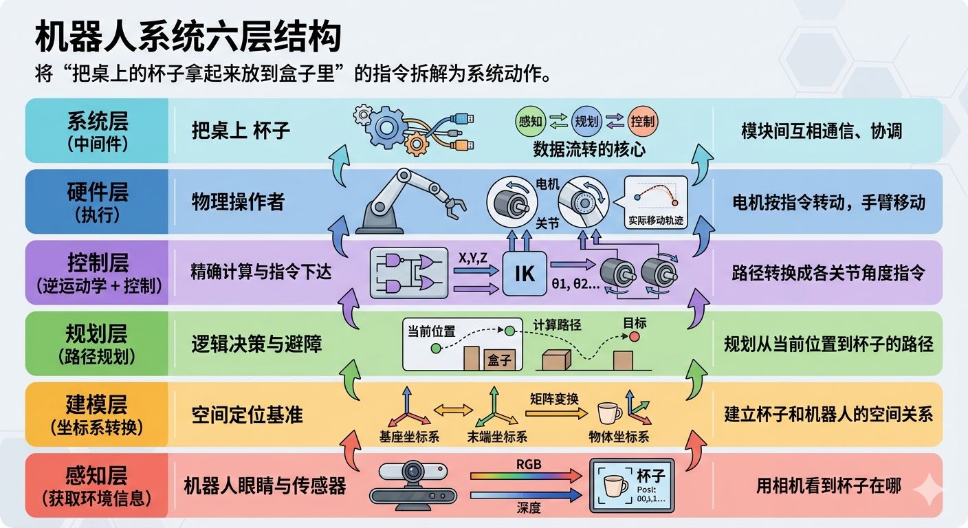 | 机器人系统六层结构 | 感知→建模→规划→控制→执行,系统层贯穿全部 |