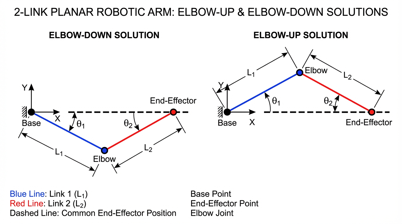 在 MoveIt 2 里,IK 求解器会根据这些约束自动选择,但理解双解的存在是调试的基础。