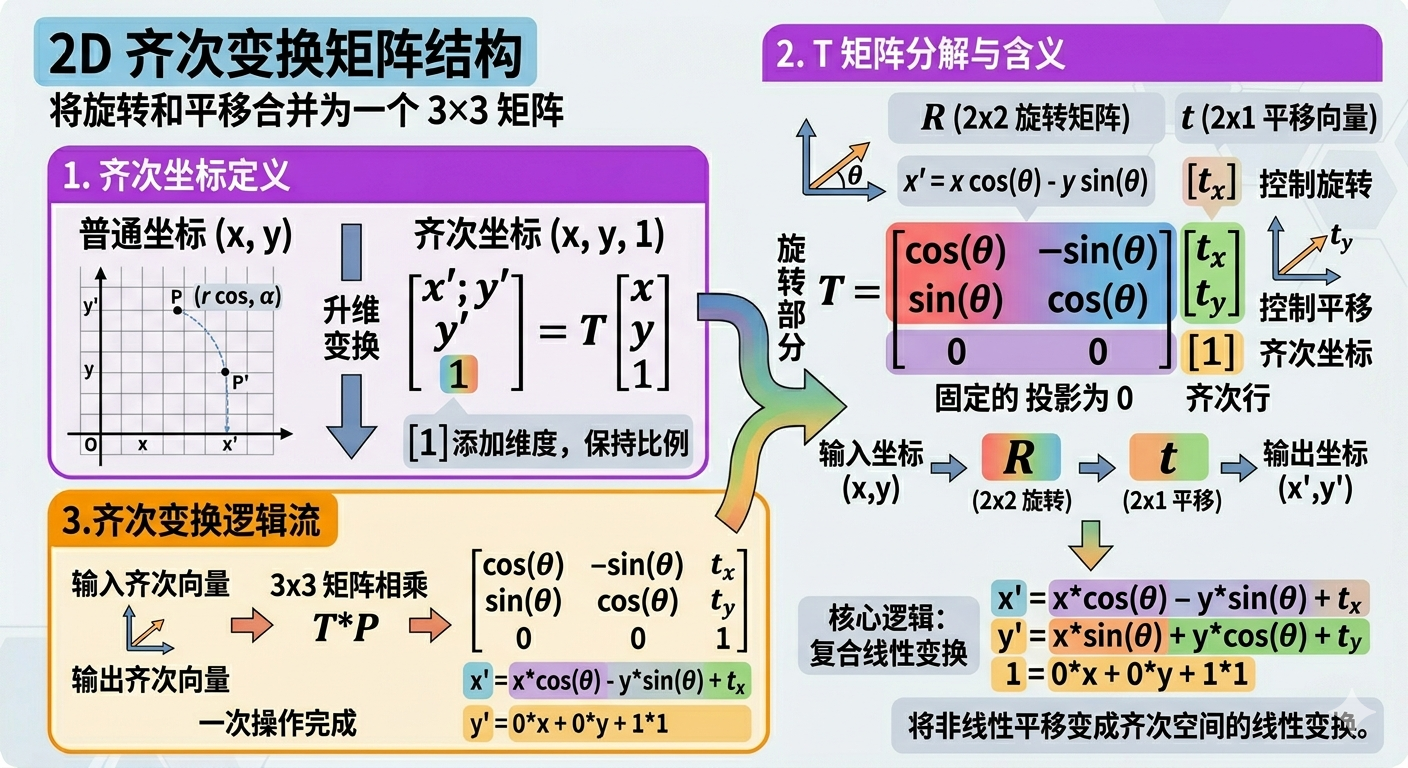 齐次变换矩阵3×3 矩阵,把旋转和平移合并成一个操作